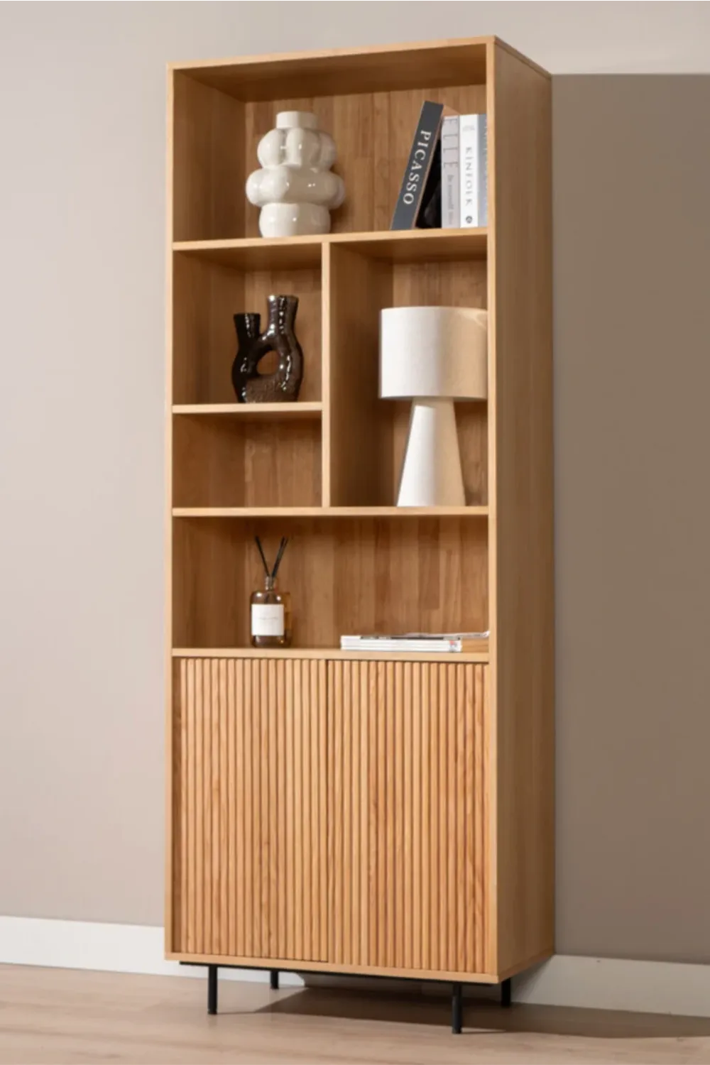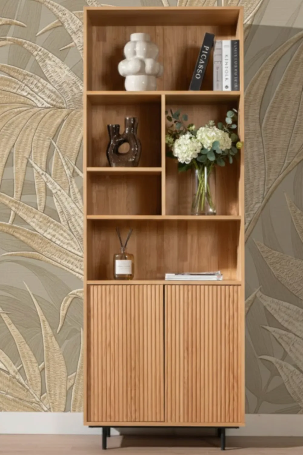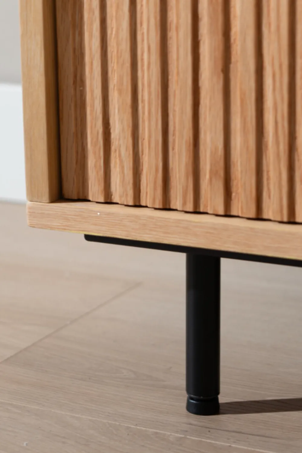 De fronten van de kastdeuren hebben een gestreept design, waardoor de houten kast een elegante uitstraling heeft. Dit design heeft dezelfde look als die van een houten wandpaneel en het meubel is daardoor ook perfect te matchen.