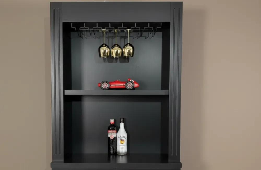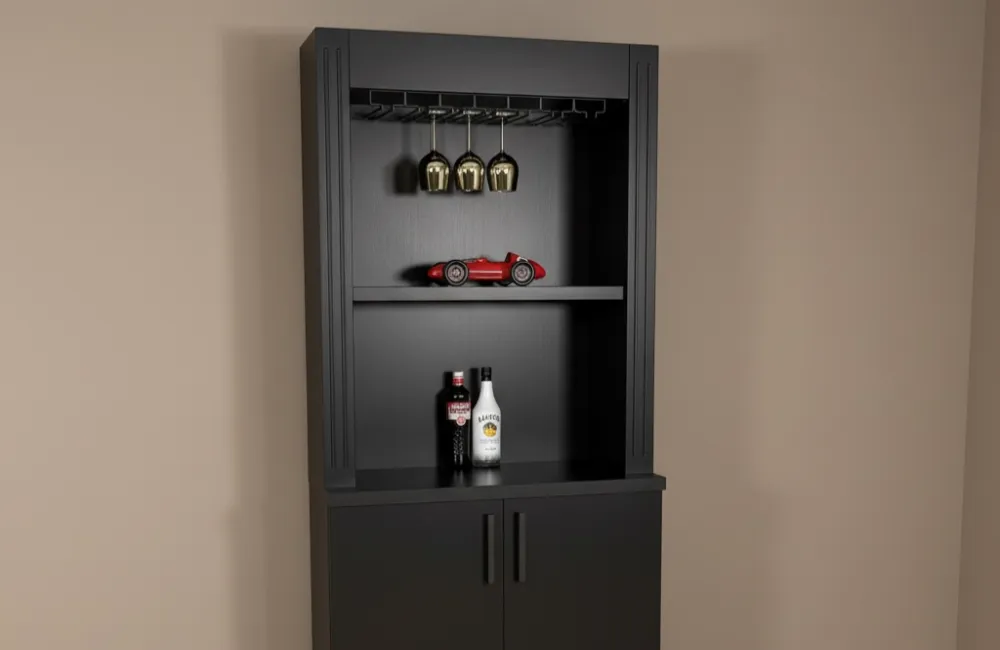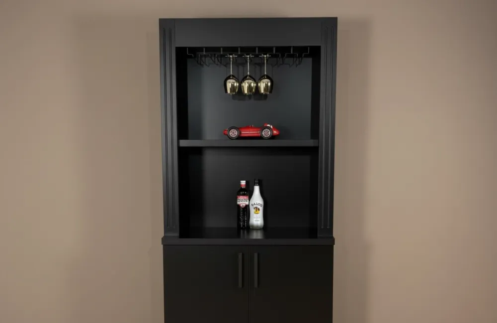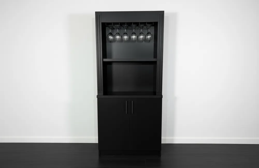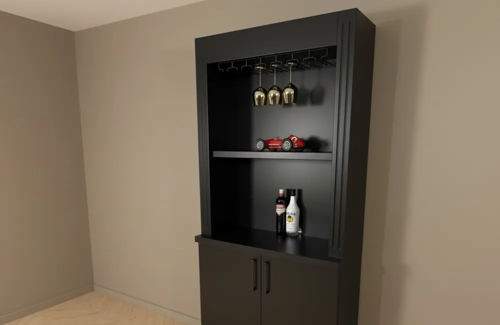Bovenin is een praktisch glazenrek geplaatst voor het ophangen van wijnglazen. Dit glazenrek is geschikt voor verschillende soorten glazen met een voetmaat van ongeveer 4 tot 9 cm, waardoor wijn-, cocktail- en champagneglazen eenvoudig kunnen worden opgehangen.