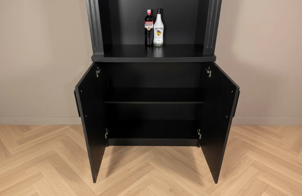 De achterkast New York met strepen design past perfect achter een bar, maar is ook zeer geschikt als drankenkast voor op de zaak, op kantoor of in een kantine.