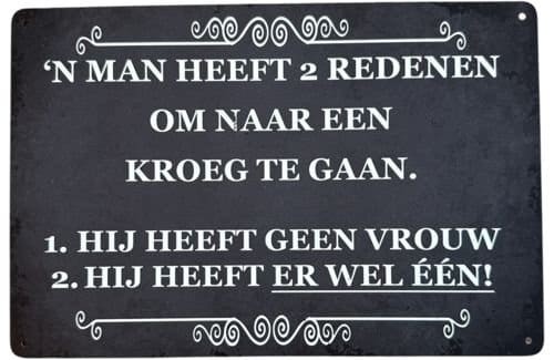 Dit bord zegt precies zoals het is: een man heeft altijd een goede reden om naar de kroeg te gaan — of hij nou wél of geen vrouw heeft!