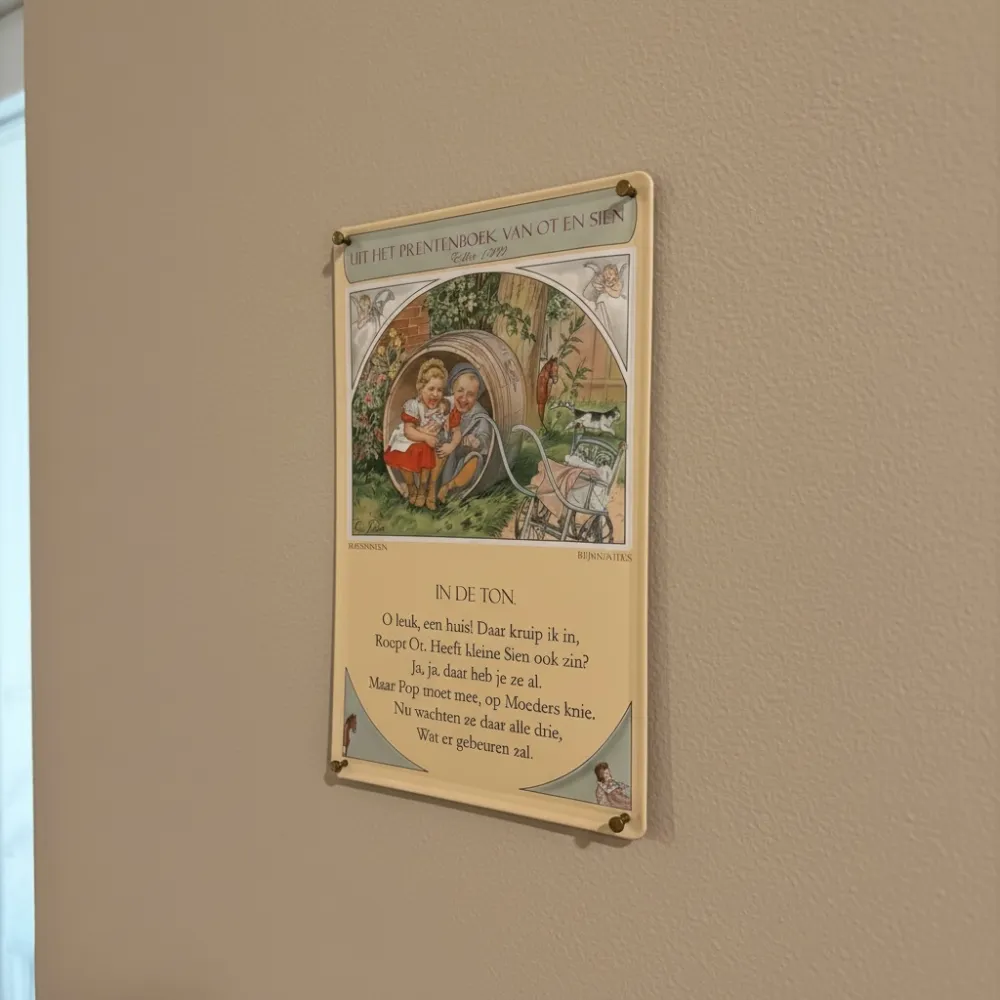 Prachtig nostalgisch reliëf bordje geïnspireerd op het prentenboek van Ot en Sien. Door het reliëf krijgt de afbeelding extra diepte en karakter, wat het bord een warme en authentieke uitstraling geeft.