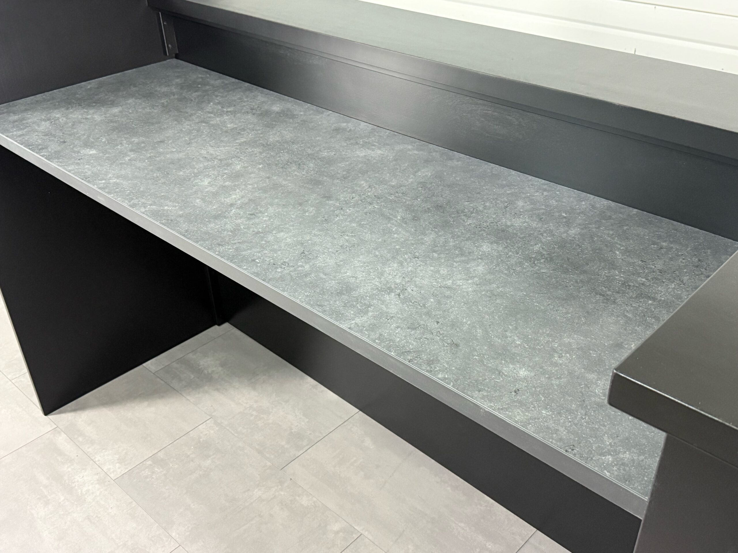 Het werkblad is uitgevoerd in hoogwaardig HPL (High Pressure Laminate), een materiaal dat bekend staat om zijn duurzaamheid en gebruiksgemak.