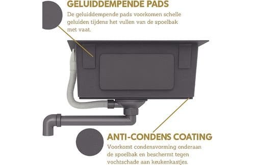De spoelbak is voorzien van geluiddempende pads die harde contactgeluiden verminderen én een speciale anti-condens coating om vochtvorming onderaan tegen te gaan. Dankzij het diepe ontwerp biedt deze spoelbak ook extra gebruiksgemak voor grote potten of pannen.